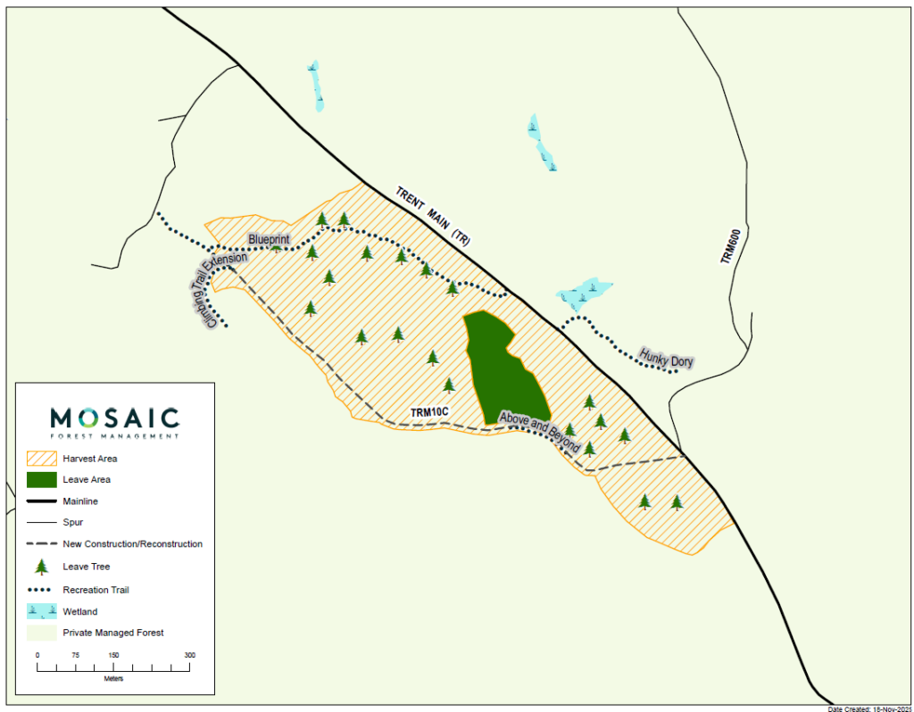 Mosaic Forest Management wishes to advise users of the area shown in the below map (area marked in orange), that road reconstruction (labelled TRM10C & known as Above and Beyond trail) will commence in February 2026 with harvesting to follow. For the public’s safety, we ask that you avoid this area while active operations are underway.